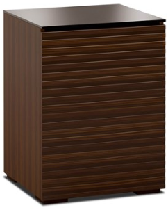 This sleek, streamlined design features a horizontal pattern on opium brown wood with a black glass top and wood block feet. Features Infinitely adjustable, black interior shelves. Built-in ventilation louvers for better air flow keep equipment cool.