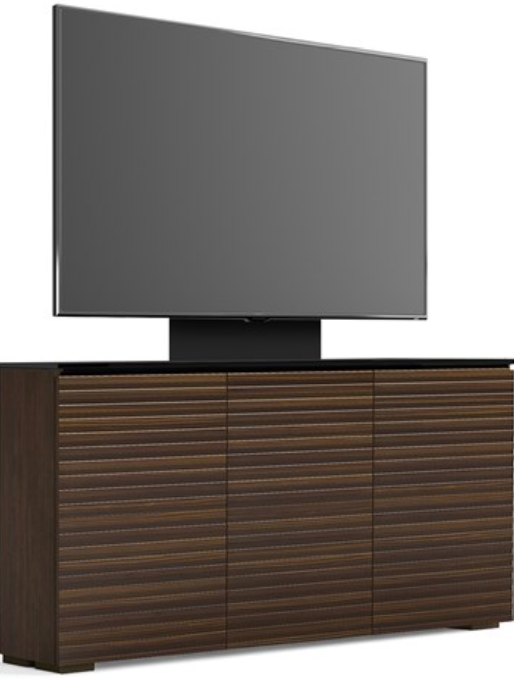 The sleek, streamlined design features a horizontal pattern on opium brown wood with a black glass or solid surface top and wood block feet. Features infinitely adjustable, black interior shelves, and built-in ventilation louvers for better air flow to keep equipment cool.
